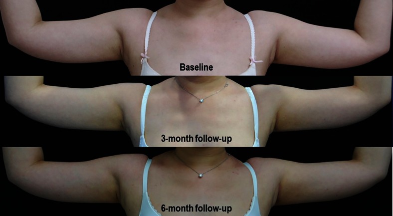 上腕または大腿内側に局在的な皮下脂肪を持つ20 人の女性に対して、脂肪冷却治療を施行。被験者はベースライン、3ヶ月、6ヶ月のフォローアップし評価。被験者の平均年齢は30.2歳、タイ人女性、平均BMIは21.15であった。