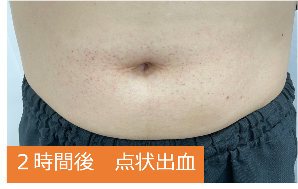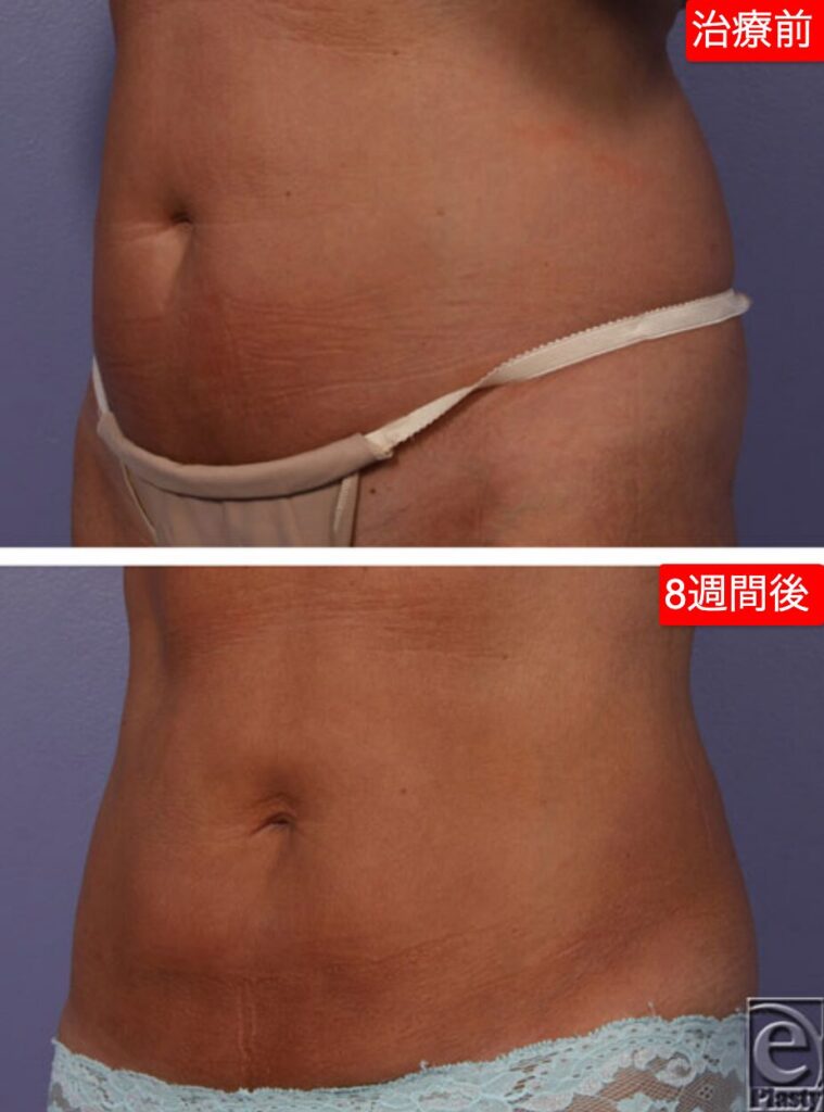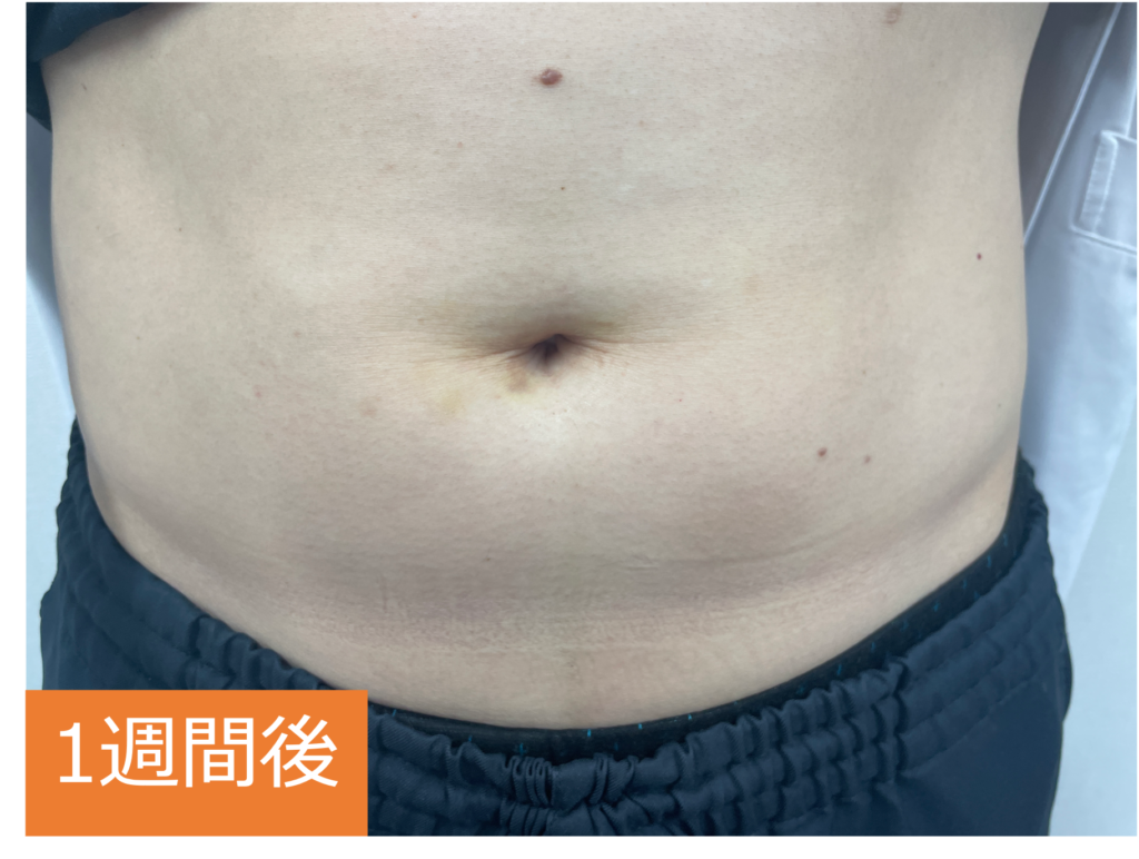 この症例では、明らかに下腹部の皮下脂肪が薄くなりスリムなラインに変化してますね。
