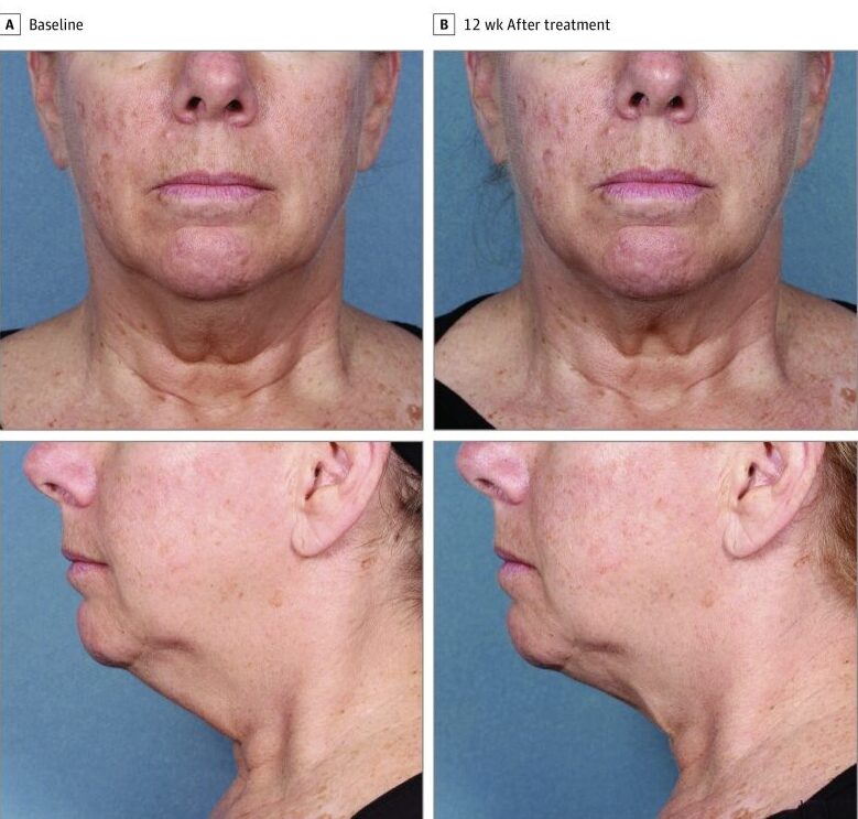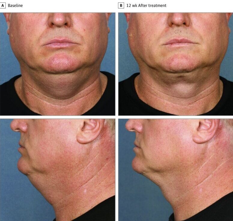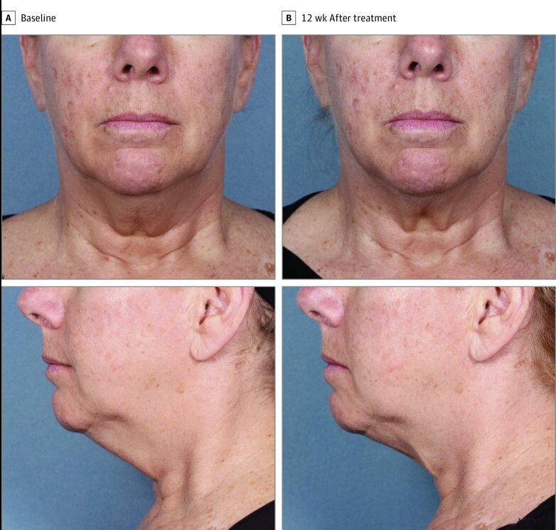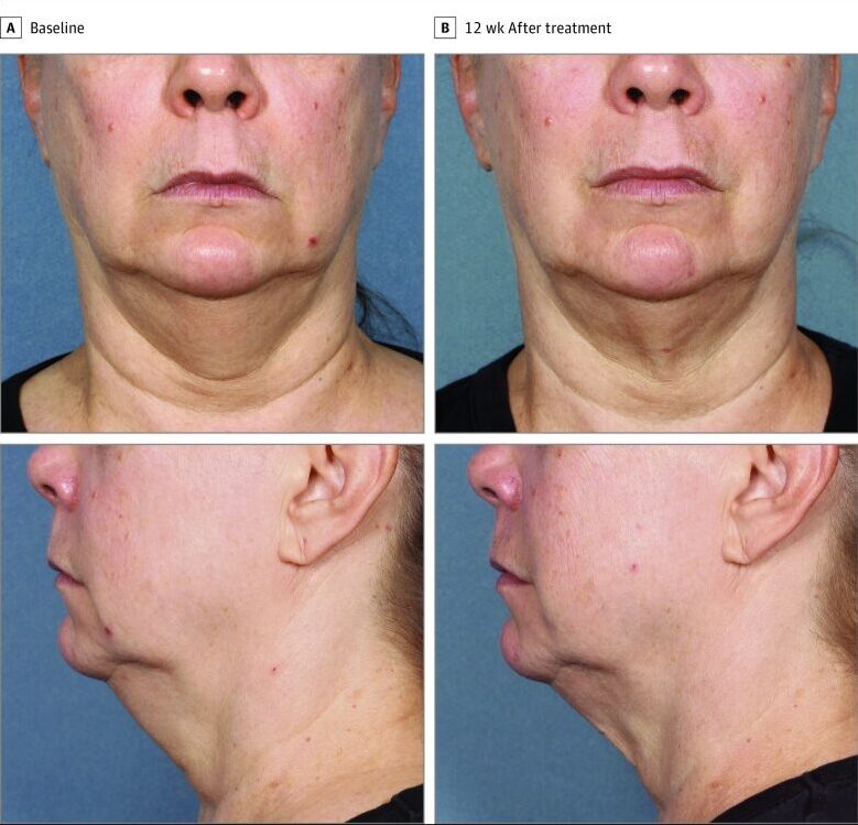 二重あご領域(中央+外側)で治療を受けた14人の参加者(女性12人、男性2人。平均年齢 50.5歳)、6週間後に2回目の治療を受け、治療後12週目に評価された。
