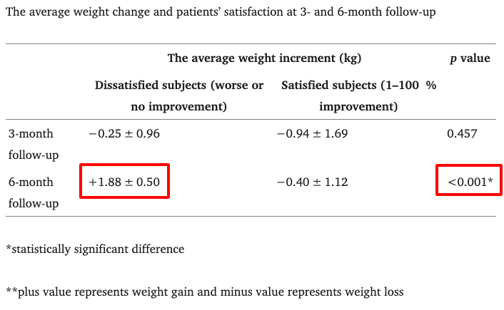 この研究では治療後6ヶ月後に結果に満足しない人では、満足している群と比べて体重が有意に増加していました。つまり、体重増加が脂肪冷却の効果実感をマスクし、不満が生じる可能性が示唆されました。