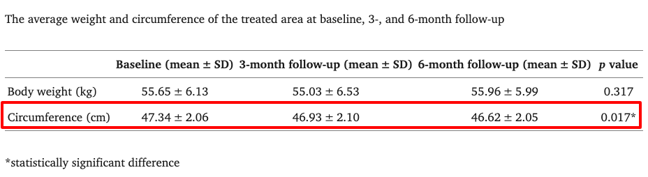 また、Shekらの研究においても、腹部のキャリパー測定値において、1回目の治療では-14.0%(p<0.001)、2回目の治療で-7.2%と有意な減少を得られています(p =0.020)