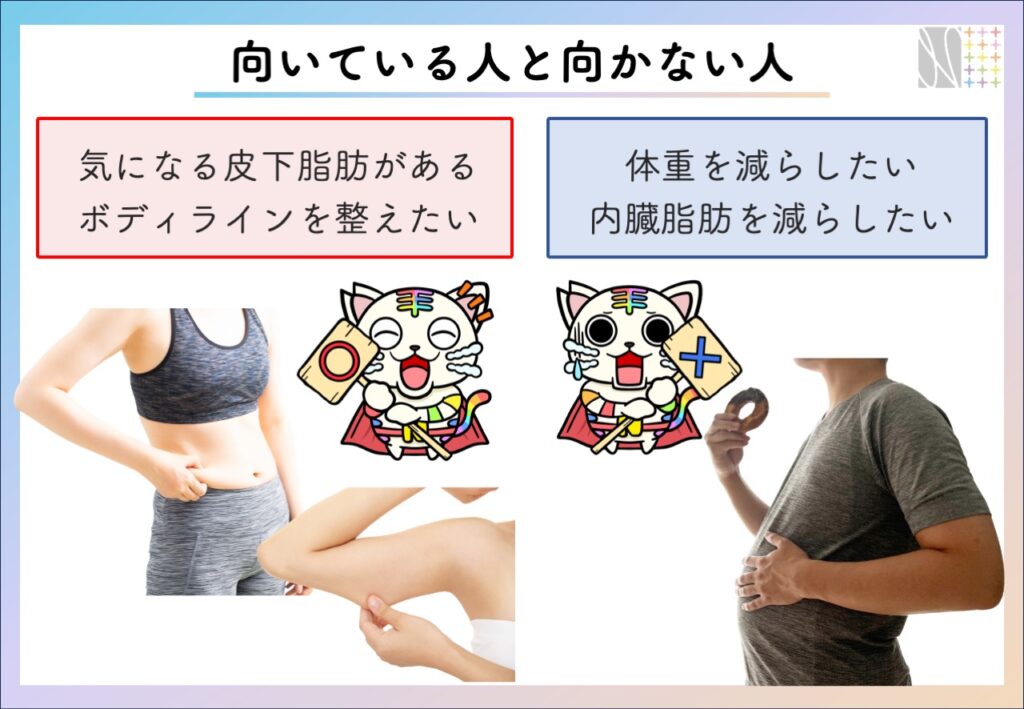 特定部位の脂肪を減らしたい人が適しています。ダイエットをしても気になる皮下脂肪がある人にも適しています。