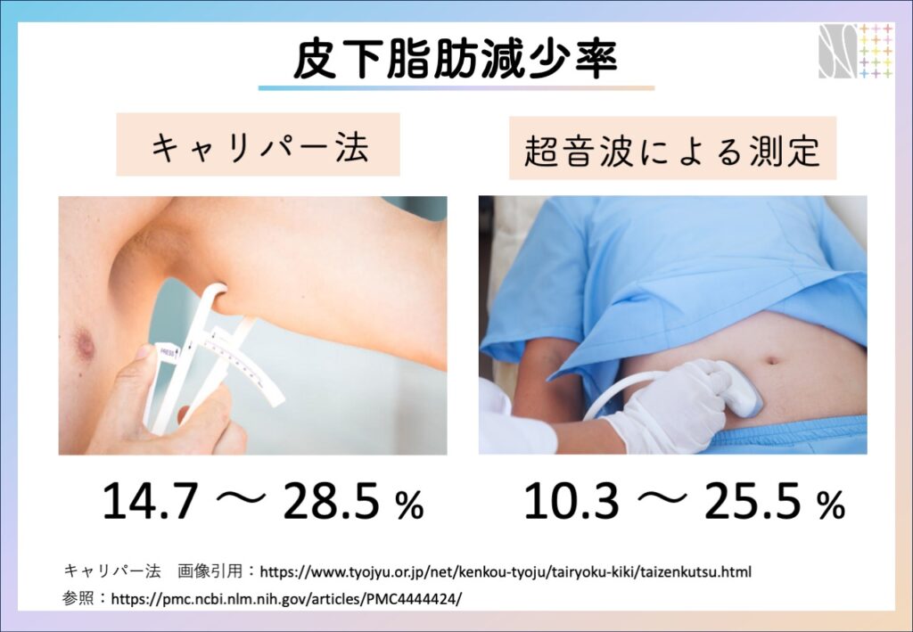 横断的にまとめた研究結果(システマティックレビュー)で、脂肪冷却治療による皮下脂肪の平均減少率を調査しました。皮下脂肪の平均減量率はキャリパー測定(実測)では14.7%〜28.5%で、超音波を用いた評価では 10.3〜25.5%でした。