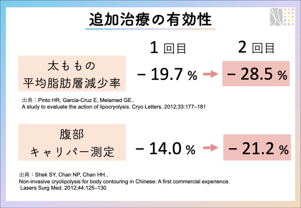 Pintoらの研究では、太ももの脂肪冷却を1回受けた患者の平均脂肪層減少率は19.7%でしたが、2回の治療を受けた患者では28.5%に上昇することがわかりました※。
