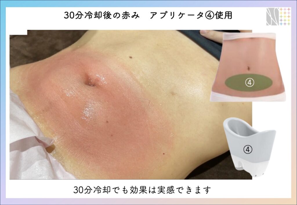 専用のアプリケーターで脂肪を吸引しながら、強力に冷却します。10分くらいで感覚が麻痺し、後半は少し痛いくらい(我慢できる程度)でした。完了したら表面はキンキンに冷たくなっていました。