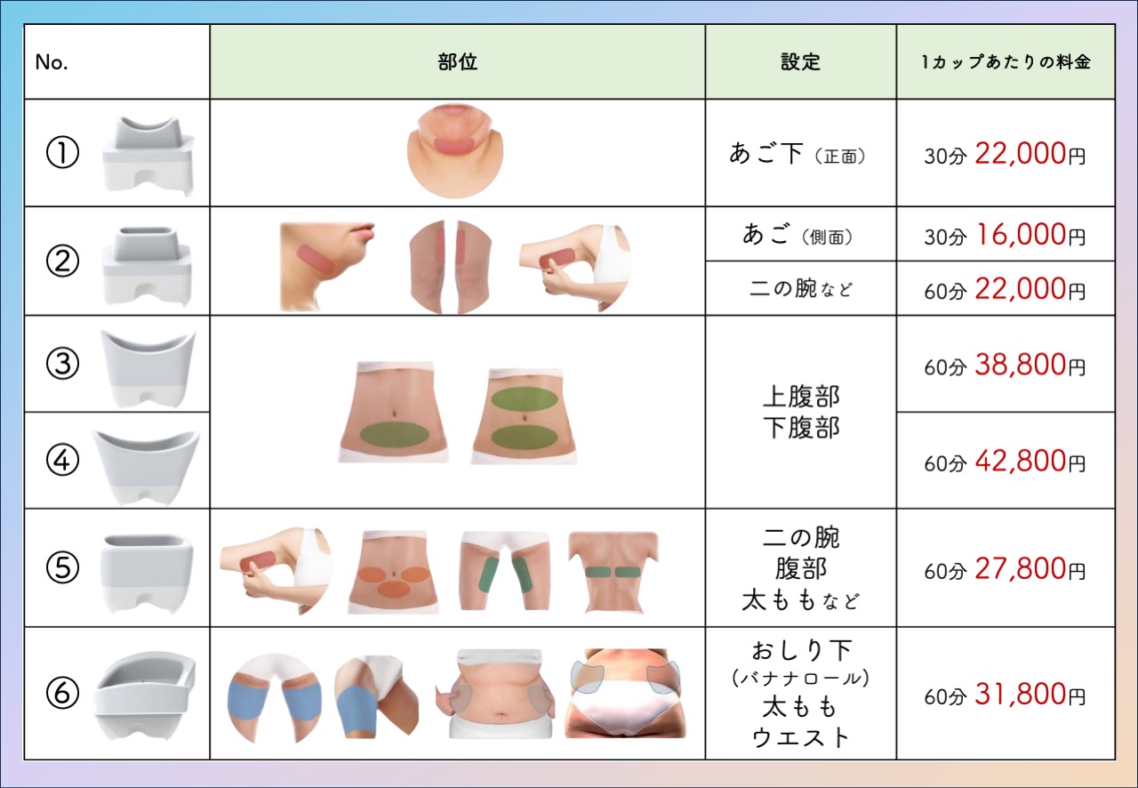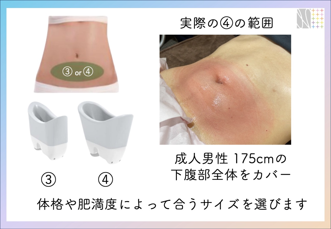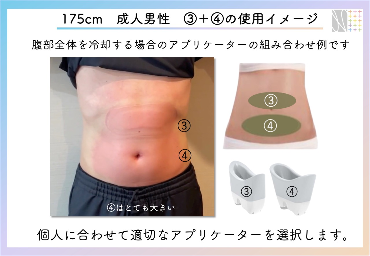 施術希望部位や脂肪のつき方に応じて複数のアプリケーターから最適なものを合わせ選択していきます。小さいものから大きいものまで、その大きさに応じて料金を設定しています。