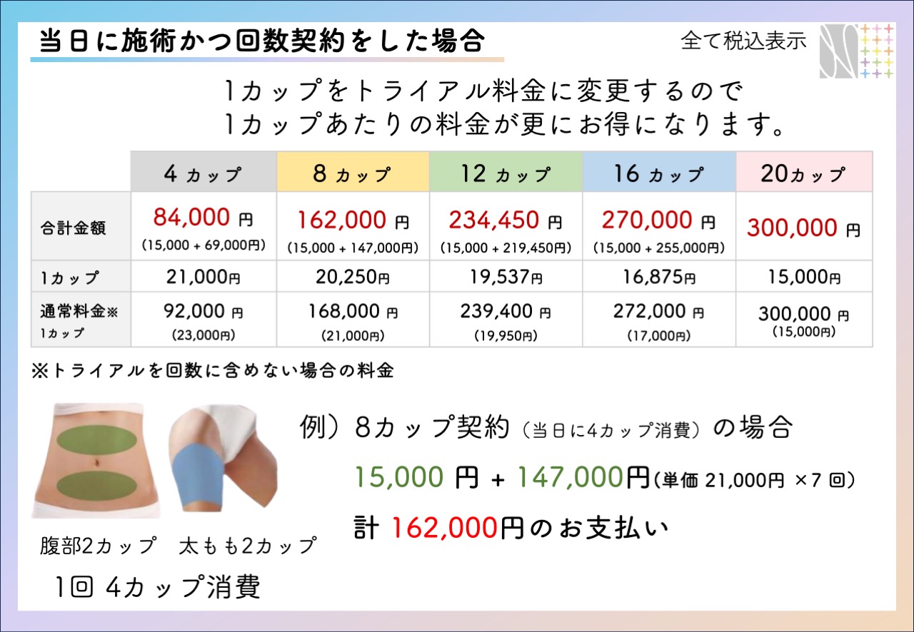 「トライアル施術を受けなないと損?」と思われるかもしれません。そのような方に向けて、当日に回数契約を行いたい場合に損することなく施術開始できるように「回数契約の1カップ料金をトライアルプランと同じ料金に変更」するサービスを行っております。