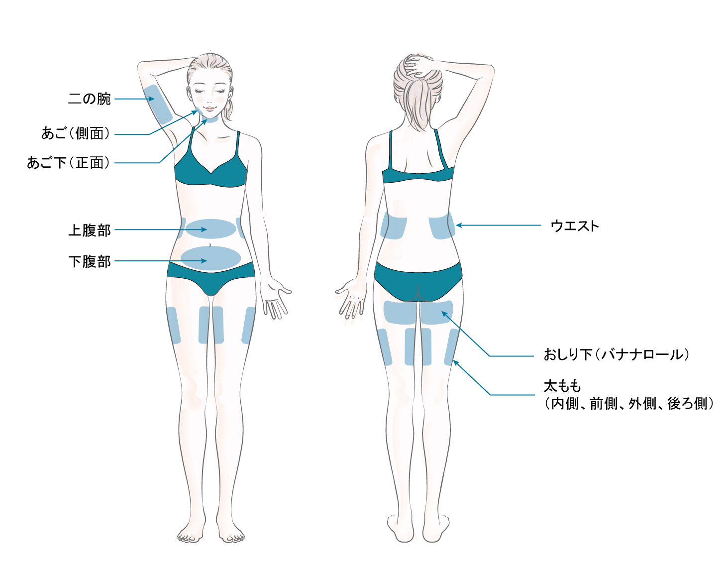 腹部(下腹部)、臀部(おしり下)、二の腕、太ももが人気があります。まずは気になる部位を中心に施術することをオススメしています。