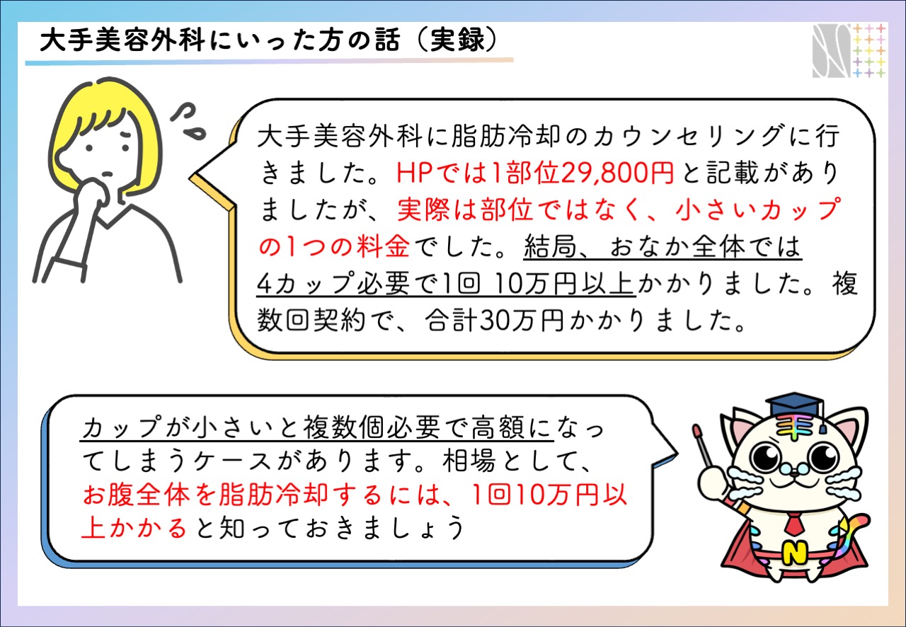 美容クリニックで施術される脂肪冷却は1カップあたり2〜5万で、1部位1〜4カップ使用し、3〜10万円程度になります。(カップが小さいため、複数使用前提が多い)